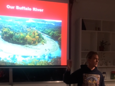 Both events followed a similar agenda. Drew Lee, a history student at the University of Arkansas, presented a PowerPoint on the history of the battle for the Buffalo. He then highlighted current concerns for the pollution caused by the C & H Concentrated Animal Feeding Operation (CAFO). Finally, he focused on the positive actions we need to take in order to keep the Buffalo River safe and clean. At the Fayetteville benefit, Teresa Turk presented a video of the hazards of algae growth, while in Bentonville Drew showed sides on the same topic. Adding continuity and humor, Laura Timby served as MC for the Fayetteville event, while Lowell Collins hosted the Bentonville occasion.