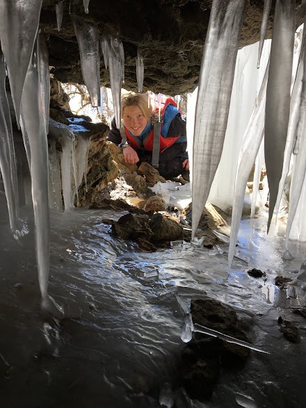 The river greeted us with perfect conditions for a winter paddle—not too high, not too low. The water was just right for floating smoothly through the riffles and shoals, with no dragging to fuss about but still calm enough to feel safe. The ice on the water extended 10-20 feet into the larger pools, but only a foot or so into the moving water. The bluffs rose tall and snowy, dripping with glittering icicles that seemed to catch every ray of the brilliant winter sun. We stopped to poke around in some shallow caves, where rare magic waited. Tiny candlestick-shaped stalagmites dotted the floors like frosty little soldiers, their icy blue color glowing in the dim light. We made a short foray into Jam-Up Cave, where icicles dangled from the ceiling right alongside the stalactites—an unusual and beautiful sight we won’t soon forget. Midday, we pulled off to warm up and refuel. A sunny ledge in front of a south-facing bluff made the perfect lunch spot. The bluff acted like a reflector oven, bouncing the sun’s rays back at us and giving the illusion of a little warmth on a chilly day. We sat there, soaking it all in—the sunshine, the snow, and the quiet beauty of the river. Of course, the teens added their own flair to the day. They had a grand time running their boats up onto the ice floes along the riverbanks, laughing as the ice crunched and slid under the hulls. It’s not a proper adventure without a little fun and some mischief, and they didn’t disappoint.